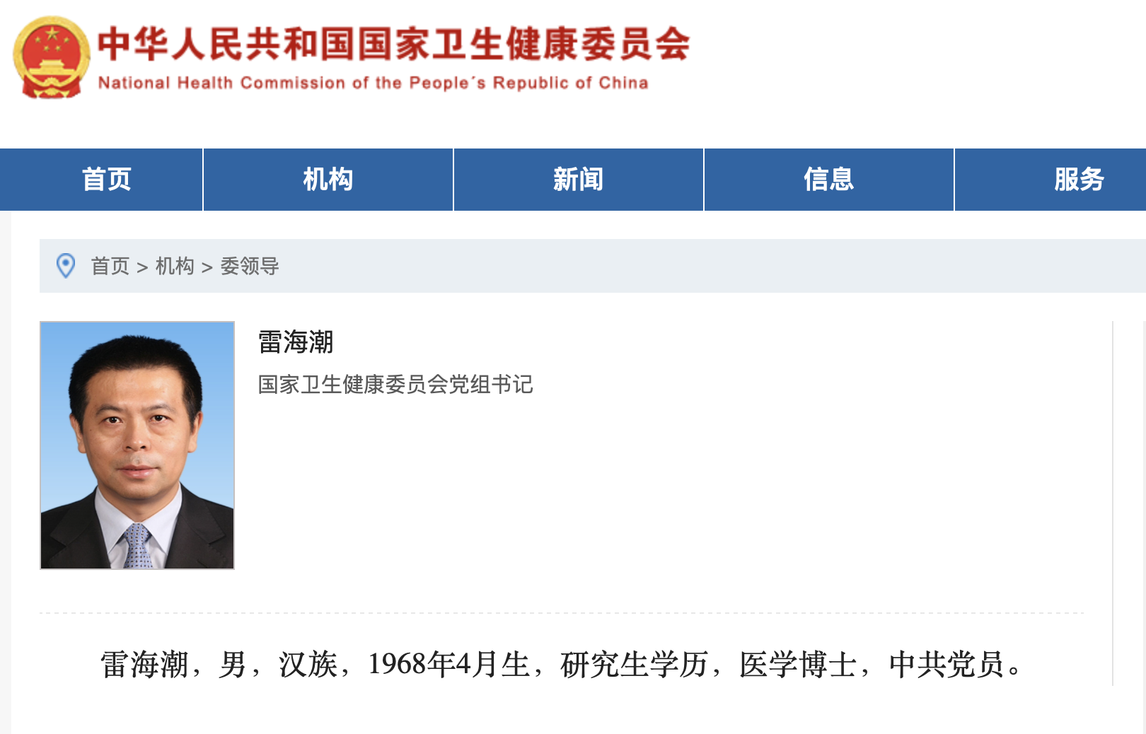 国家卫健委网站“委领导”栏目更新显示,雷海潮已任国家卫生健康委员会党组书记。