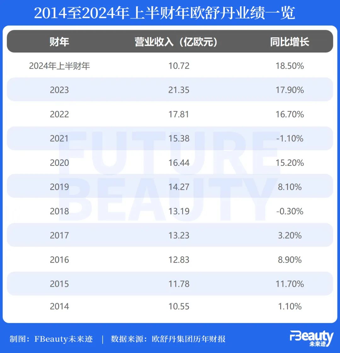 财报数据显示,欧舒丹在2014年至2024年上半财年间的营业收入基本保持平稳上升趋势,除了2021年略微下滑之外,2023年更是首次录得超20亿欧元营收的好成绩。