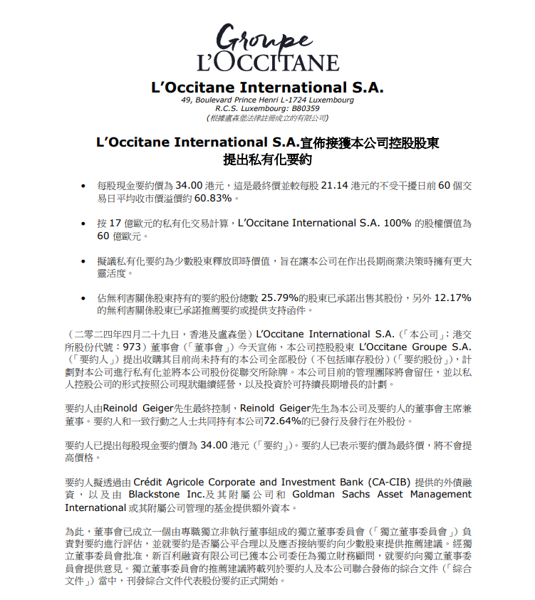 千呼万唤使出来,4月29日晚间,欧舒丹私有化“内幕消息”终于浮出水面。