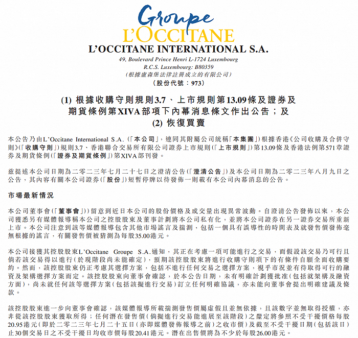 但媒体和公众似乎“并不买账”。就在传闻愈演愈之时,欧舒丹于去年8月9日短暂停牌,停止交易时间直到14日。在此期间,欧舒丹方面发布了一则公告。相较于之前的澄清,该份公告可谓是信息量巨大。