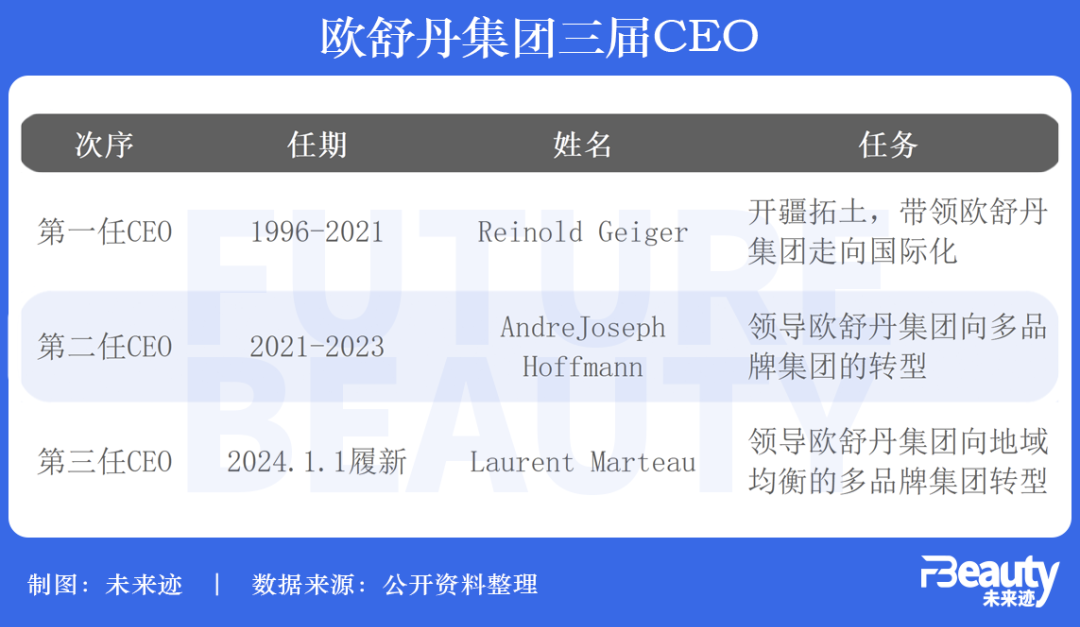 至此,欧舒丹集团自成立以来已经迎来第三任CEO,而在安德烈·霍夫曼(Andre Joseph Hoffmann)离任、Laurent Marteau上任之时,首任CEO Reinold Geiger仍然是集团主席。