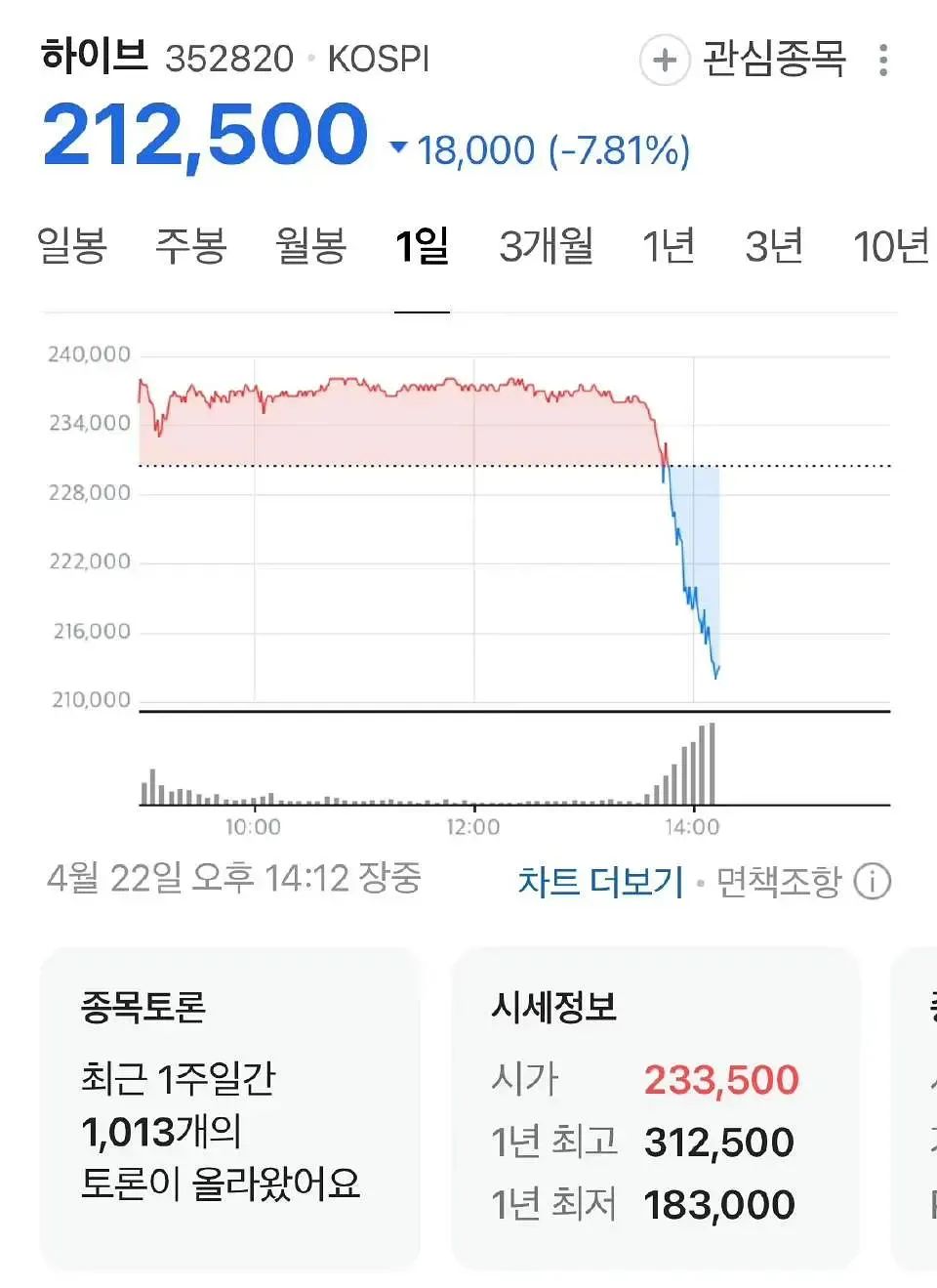 4月22日,HYBE股价大跌,收盘价为212500韩元,较前一交易日下跌18000韩元,HYBE在盘中暴跌10.63%。