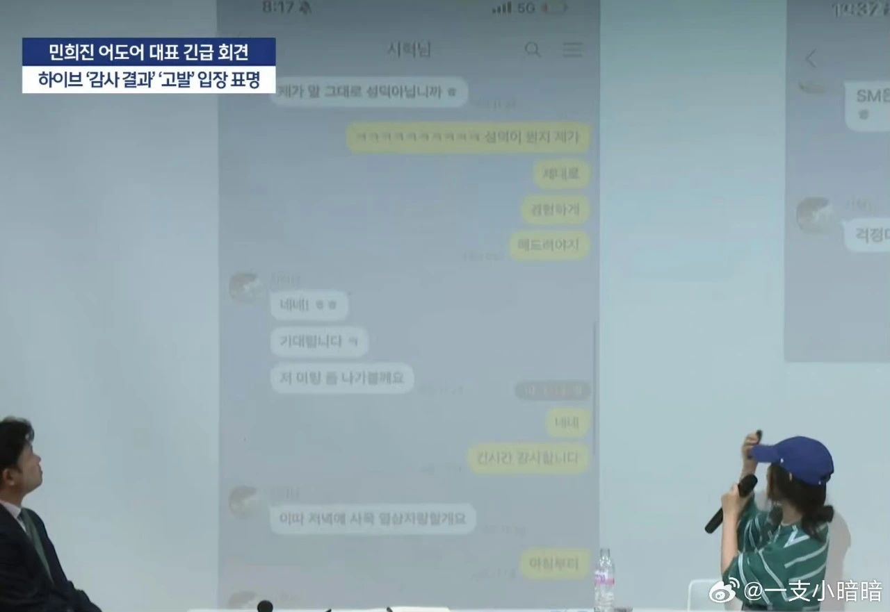 终于来到4月25日的发布会,除了开篇提及的腥风血雨,闵熙珍也在发布会上公开了自己与方时赫的聊天记录,对方问其“能把aspea踩在脚下吧?”还发送“拜托了”的表情包。