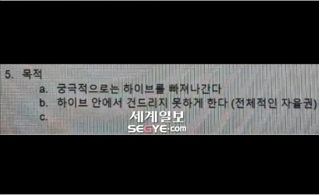 ADOR管理层A某则回击,声称HYBE发现的“ADOR内部文件”只是“备忘录级别的文章”,闵熙珍并不知情,被泄露给了HYBE后,被包装成了巨大阴谋的‘内部文件’。