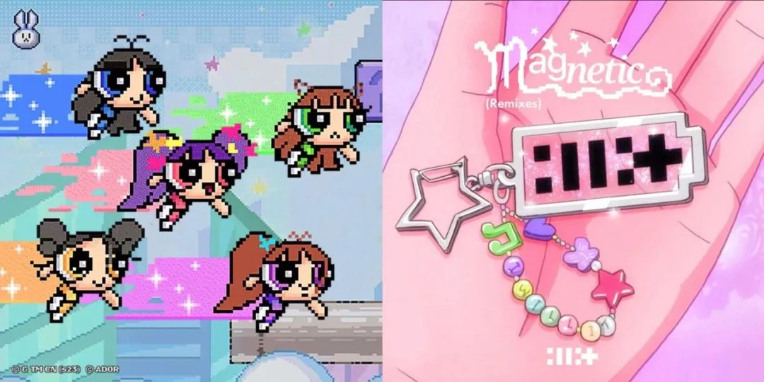 比如闵熙珍指控的ILLIT,和NewJeans一样同为五人团,且成员年龄相近,风格更是趋近。ILLIT的专辑《SUPER REAL ME》中也采用了学院风的装束、像素风的字体设计,而这些也都曾被应用于NewJeans。