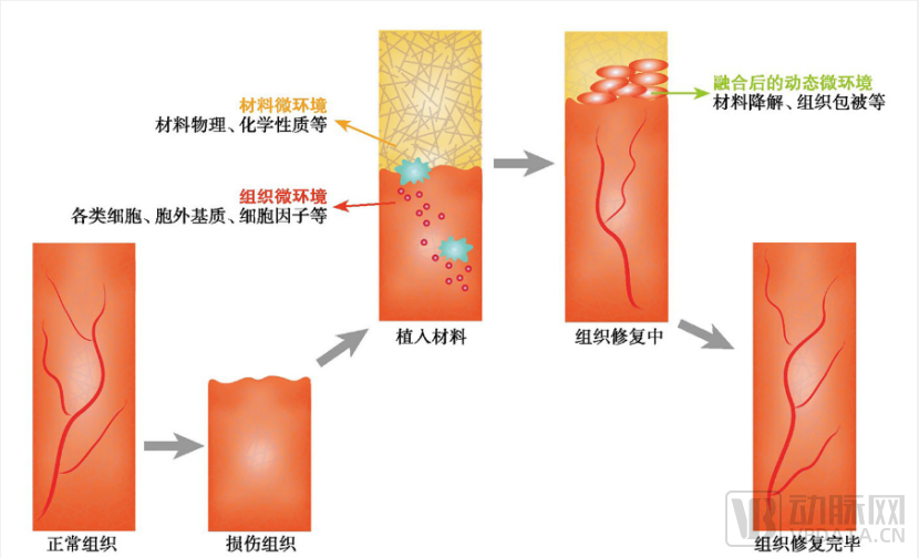 各类组织器官的修复与再生离不开稳定的微环境。组织再生相关的微环境可以分为材料微环境、组织微环境和两者融合后的动态微环境。如果将细胞外基质、细胞因子和邻近的其他细胞等组织微环境都看作特殊“材料”的话,可以认为组织再生微环境其实就是一种复杂多样且伴随动态变化的材料微环境。