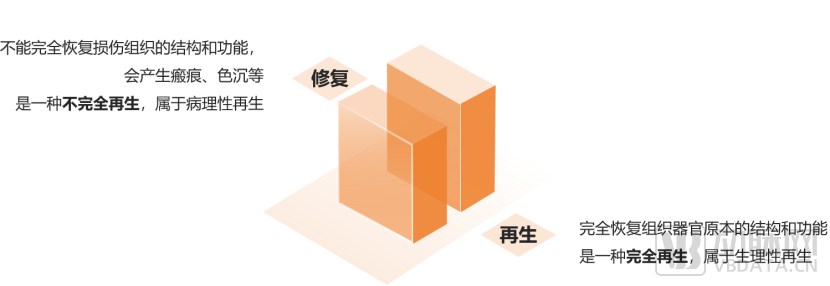 “修复”和“再生”都是作为损伤恢复的过程,负责重建受伤组织的结构和功能,目前行业内“修复”与“再生”时常一同出现,存在混淆的情况。