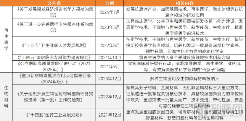 我国在生物再生材料的研发、生产及应用领域相较于国际先进水平尚存在显著差距,高端产品的供应更是严重依赖于进口。为了扭转这一不利局面,早在“十三五”规划期间,科技部便设立了国家重点研发计划——“生物医用材料研发与组织器官修复替代”专项,突破创新性组织重塑和再生性医疗器械的关键技术难题。近三年来,我国政府更是围绕再生医学与生物材料领域密集出台了一系列政策。