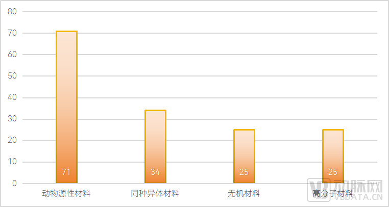 从材料类型看,动物源性材料表现突出,行业内共有71款涉及动物源性材料的产品获得上市批准,同种异体材料也是生物再生材料领域的重要组成部分,共有34款产品获得批准。