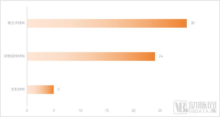 从材料类型来看,动物源性材料和高分子材料是企业研发的重点。有24家企业的产品涉及动物源性材料;涉及高分子材料的企业有30家,其中多数是聚乳酸类材料,丝素蛋白材料企业有6家。