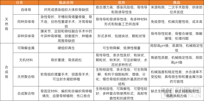 目前,基于生物再生材料的骨修复材料产品可根据其材料来源进行分类,天然骨类,如自体骨、同种异体骨、异种异体骨;人工骨类,包括无机材料、天然聚合物以及合成聚合物;此外,还有多种骨生长因子和骨形态发生因子等。