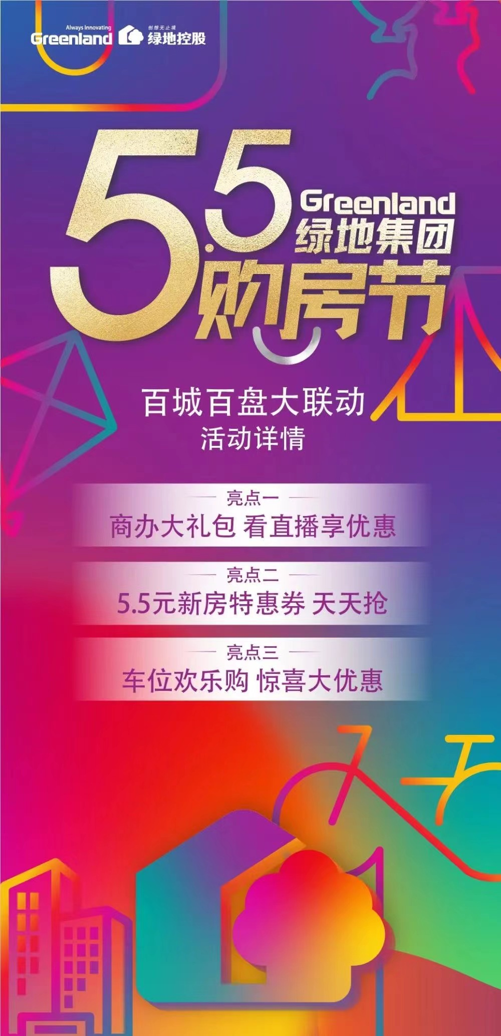 此次绿地集团“五五购房节”从5月1日开始,为期一个月,将集合绿地旗下住宅、商办、车位等各类优质物业资源,推出“商办大礼包”、“5.5元抢新房”、“车位欢乐购”、“补款折上折”等一系列“惊喜福利”活动,真金白银为全国消费者献上一场购房福利盛宴。