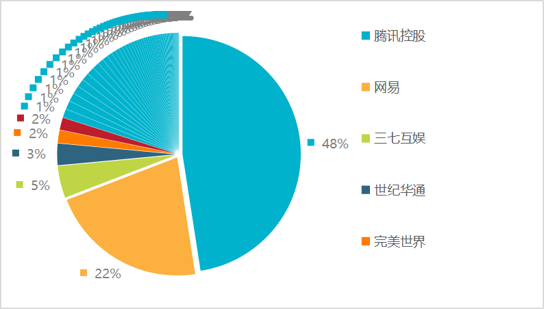 排名前五的分别为:腾讯(1179亿元)、网易(816亿元)、三七互娱(165.47亿元)、世纪华通(111.89亿元)、完美世界(66.69亿元)。