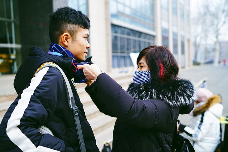 一位家长为孩子整理围巾。