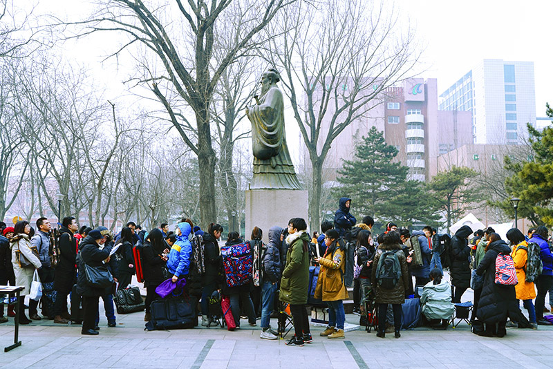 在孔子塑像下排队准备考试的考生。