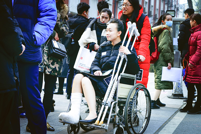 一位脚踝扭伤的姑娘让母亲用轮椅推到考场坚持考试。母亲说“孩子为了考传媒大学已经准备大半年了,这是孩子的梦想,做为父母的要支持。”