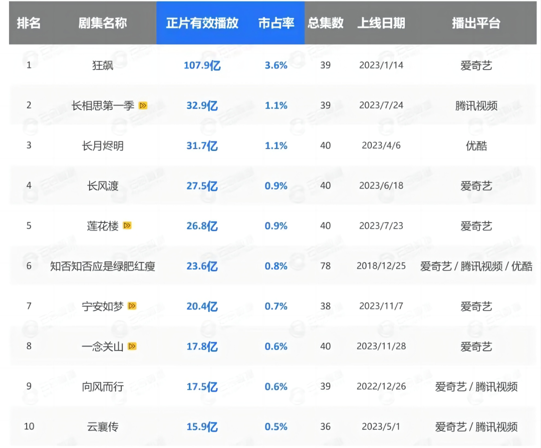 在剧集热度方面,不再是“别人吃肉我喝汤”,裤子的热剧市占率能达到10%以上,基本还能争一争前三的交椅,也少了些剧与剧之间青黄不接的窘迫。