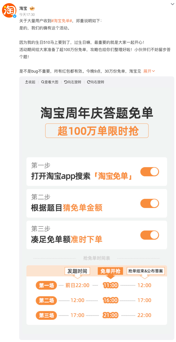 5月6日中午,#淘宝免单bug#引发网友热议,冲上微博热搜。刚刚,淘宝在其官方微博正式回应大量用户被免单:系淘宝510周年庆答题免单活动,活动期间准备了超100万份免单。只要在活动时间点答对题目,并成功购买对应金额的商品,就有机会被免单。活动每天三场。“是不是bug不重要,所有红包都有效。”