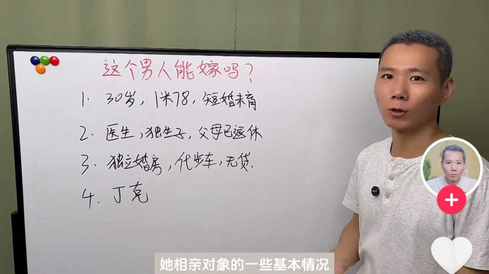 他们的形象出奇一致,往往都是站在一块黑板(白板)右侧,上面列出相亲对象的基本条件,然后一条一条拆解分析。