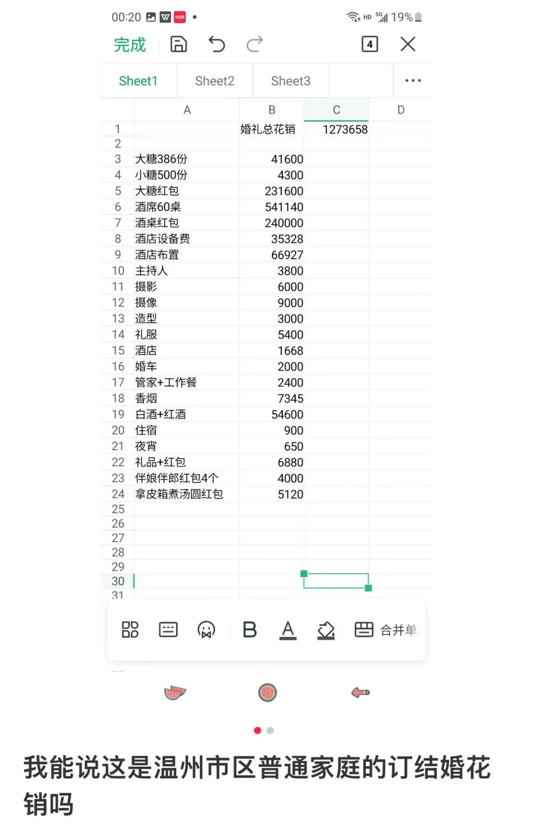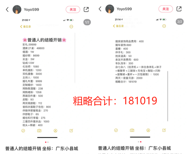 没有天价彩礼(4万),很多东西都买便宜货(两双高跟鞋才100多块钱),蜜月游也只有两天一夜……各种项目林林总总算下来,居然也超过了18万。