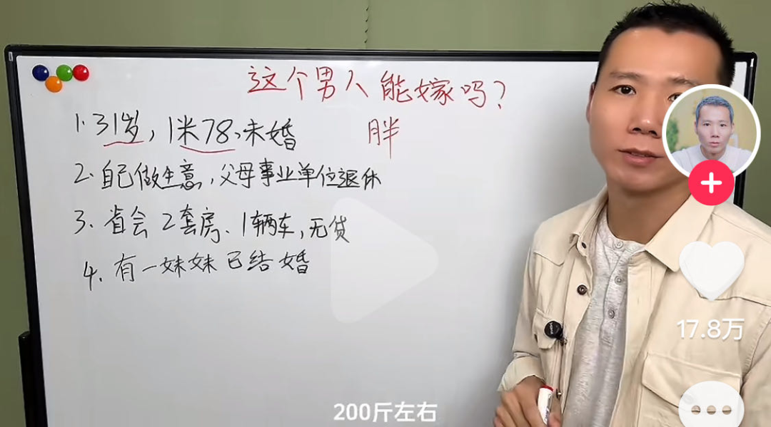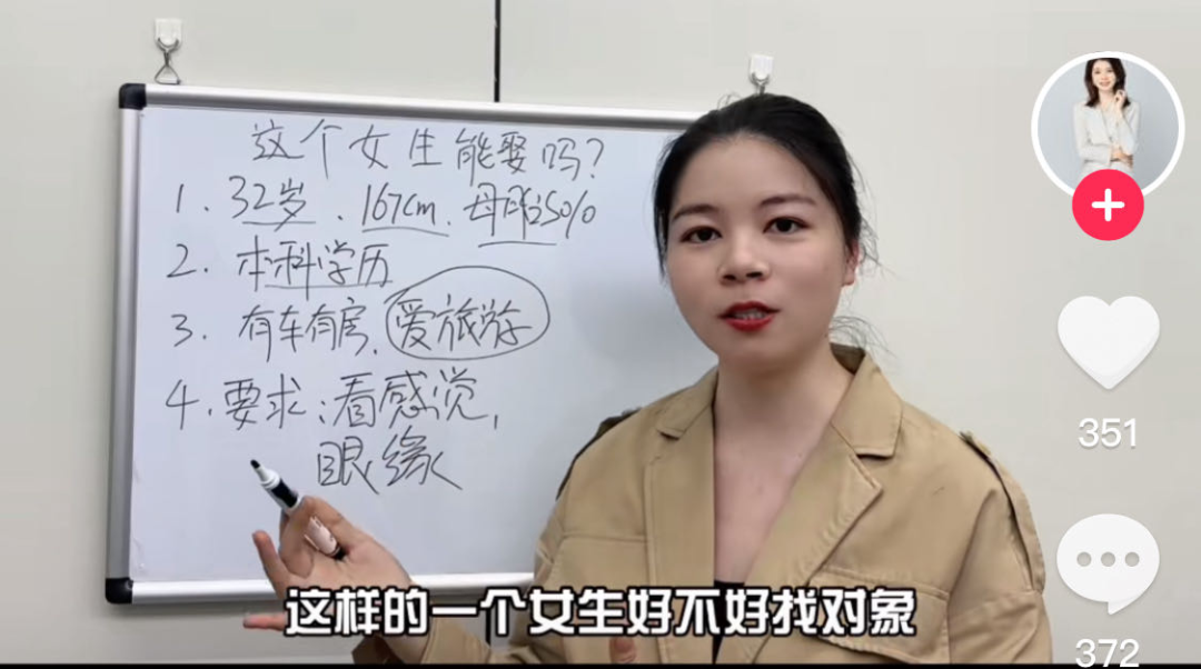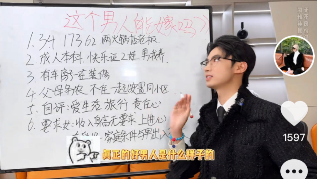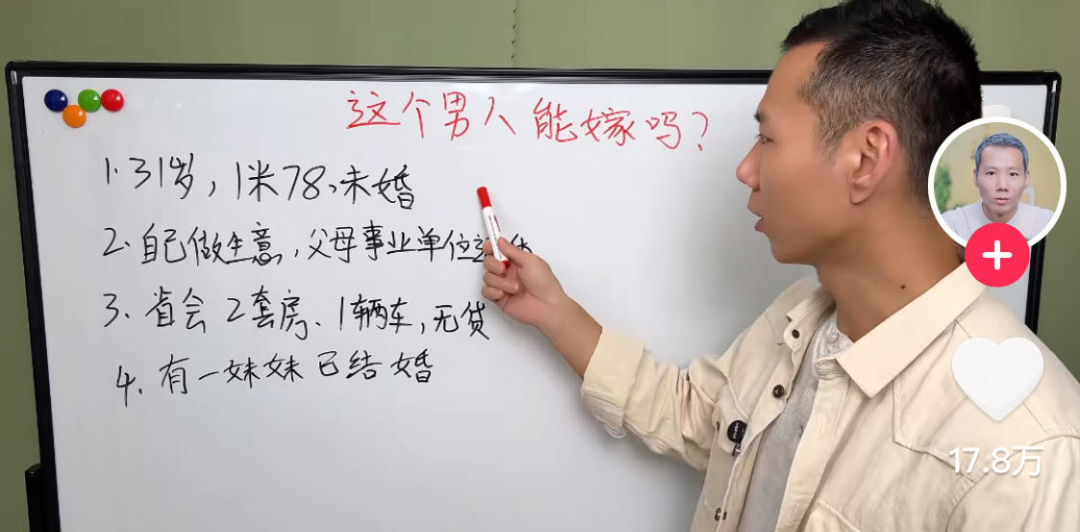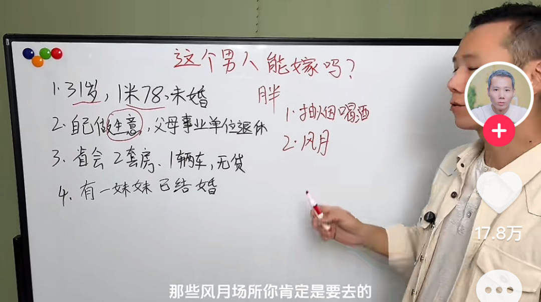 “王婆说媒”的热度还没散去,在短视频平台上,最近冒出来一群“相亲分析师”。一面白板,一支油性笔,三言两语就能把相亲市场上的“高质量男青年”“优质女嘉宾”扒得干干净净,让隐藏的“渣男渣女”无处遁形,起码能帮你避开相亲路上80%的坑。