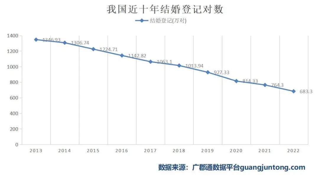 过去十年里,我国的结婚登记数量一年一个台阶稳步下跌。从1300多万跌到600多万,足足少了一半。