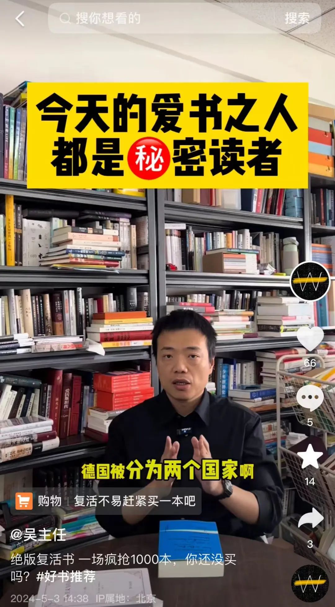 吴主任给剁椒讲起,社科文献一位主播向他推荐了这本书,社里认可这是本好书,但苦于推荐不得法,便拿给吴主任让他想想办法。翻看吴主任视频主页,首次推这本书是在2022年,他发视频介绍,然后挂小黄车,立刻就推火了这本书。