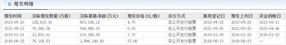 2018年定增募资高达286.62亿元,2019年再次募资10.34亿元,2021年继续募集资金54.5亿元,2023年募资60.3亿元。