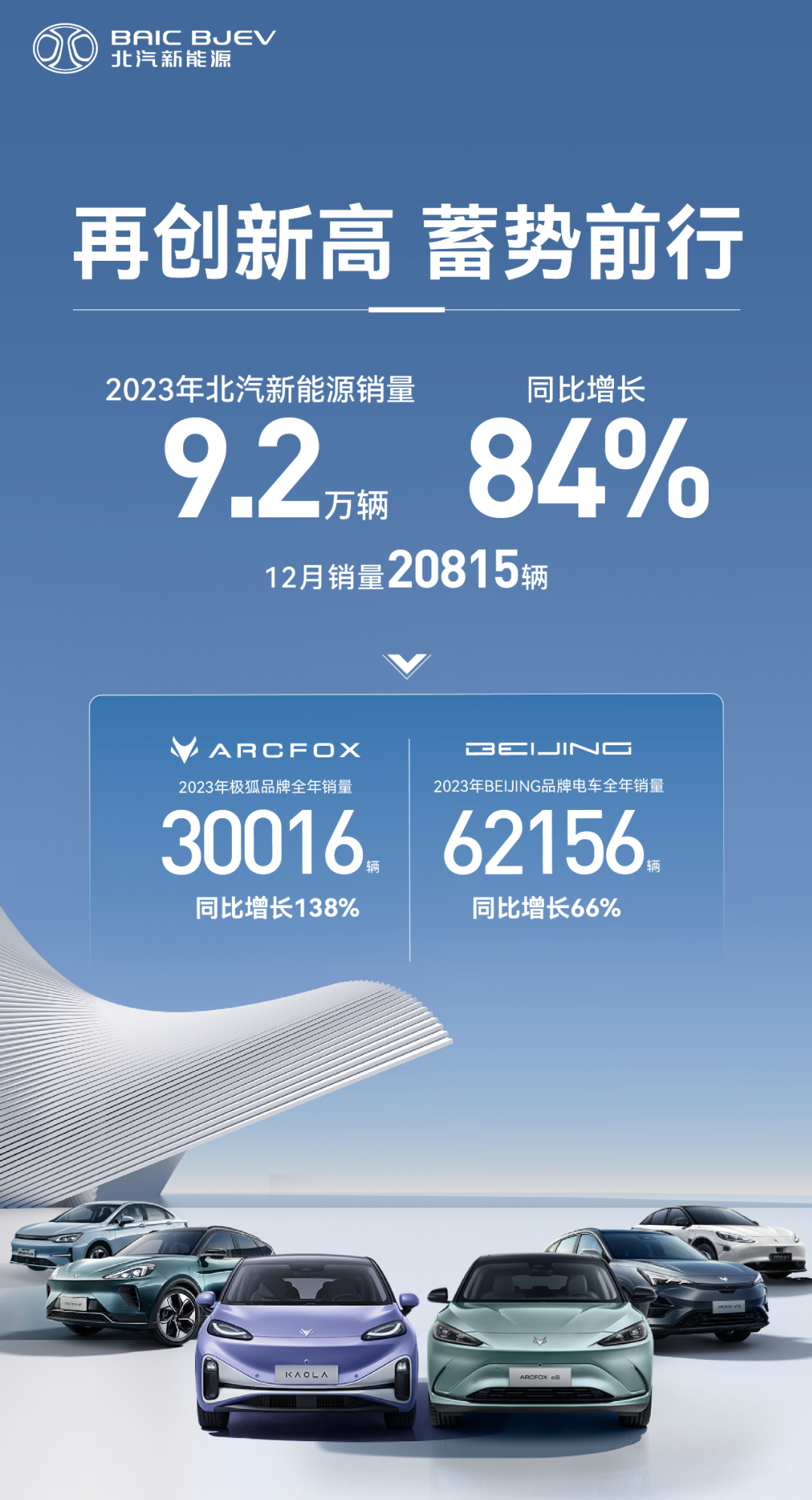 详细来看,北汽蓝谷旗下极狐汽车与BEIJING品牌电车2023年累计销量分别为30016辆和62156辆,同比分别增长138%和66%。