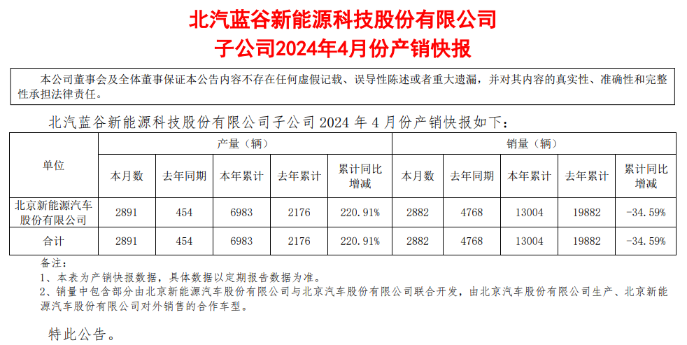 进入2024年,北汽蓝谷的销售表现似乎不太好,最新的4月产销快报显示,当月该司卖了不到3000辆车,前4个月合计不到2万辆,同比下滑超34%。