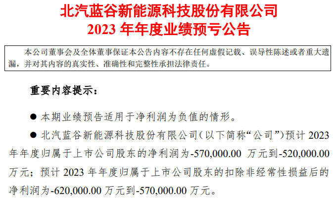 虽然年报发布的时间不算很早,但这个曾经的新能源汽车王者,如今的新能源车企亏损大户,早在2024年1月15日,即发布了其2023年年度业绩预亏公告。