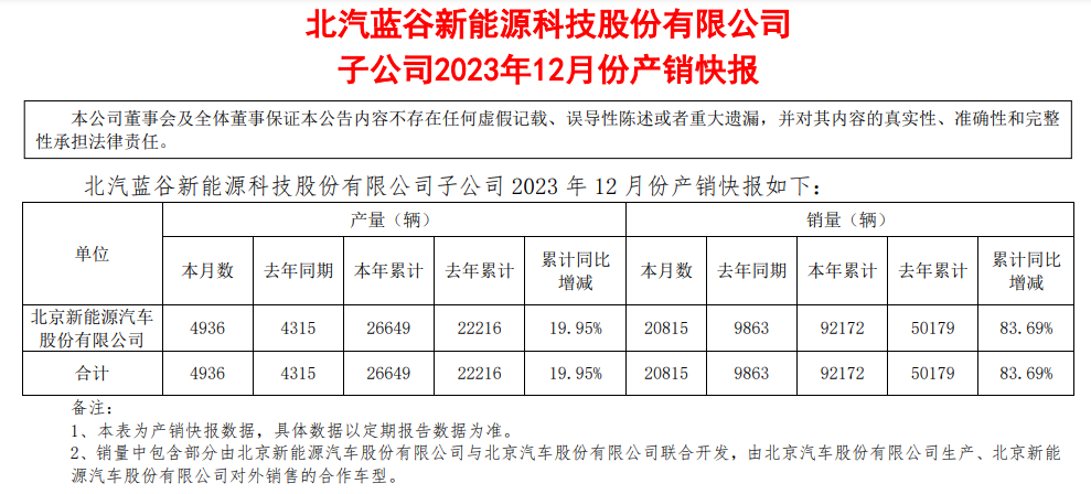 2023年12月,北汽蓝谷销量超2万辆,2023全年实现9.22万辆的销售。而2022全年,该数字为5万辆出头,相较于2022年增长了近84%。
