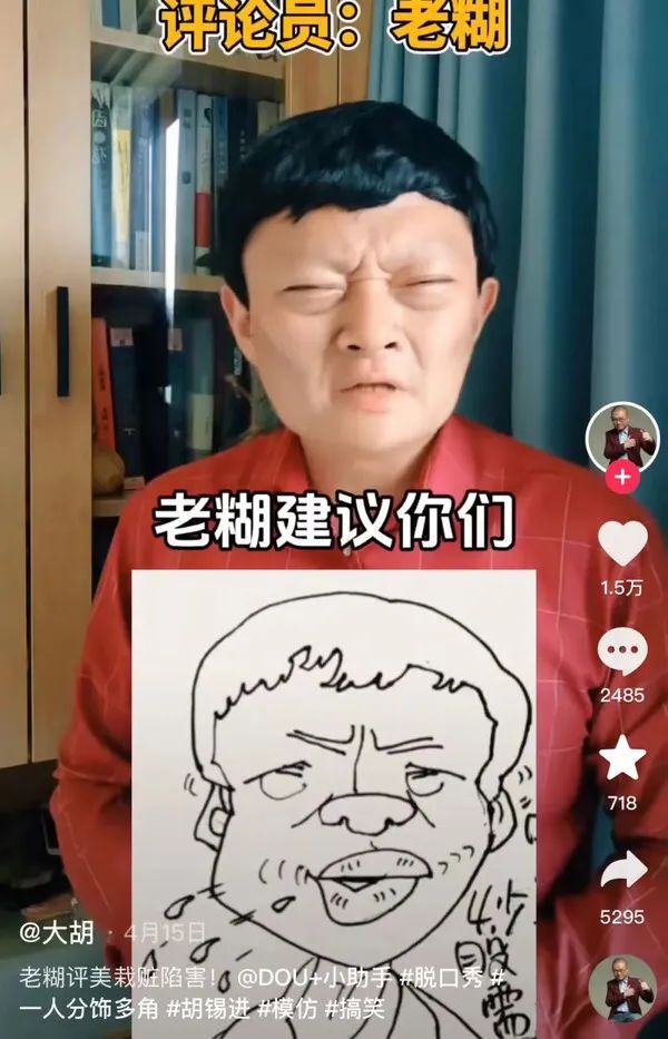 更早一些时候,还有胡锡进的模仿者走红,通过化妆、说话方式和语气的复刻,对热门事件进行评论。他的表现几乎成功的“超越”了胡锡进本人,有评论就表示,自从刷到你,再没刷到那个真老胡了。你是怎么找到这个赛道的?