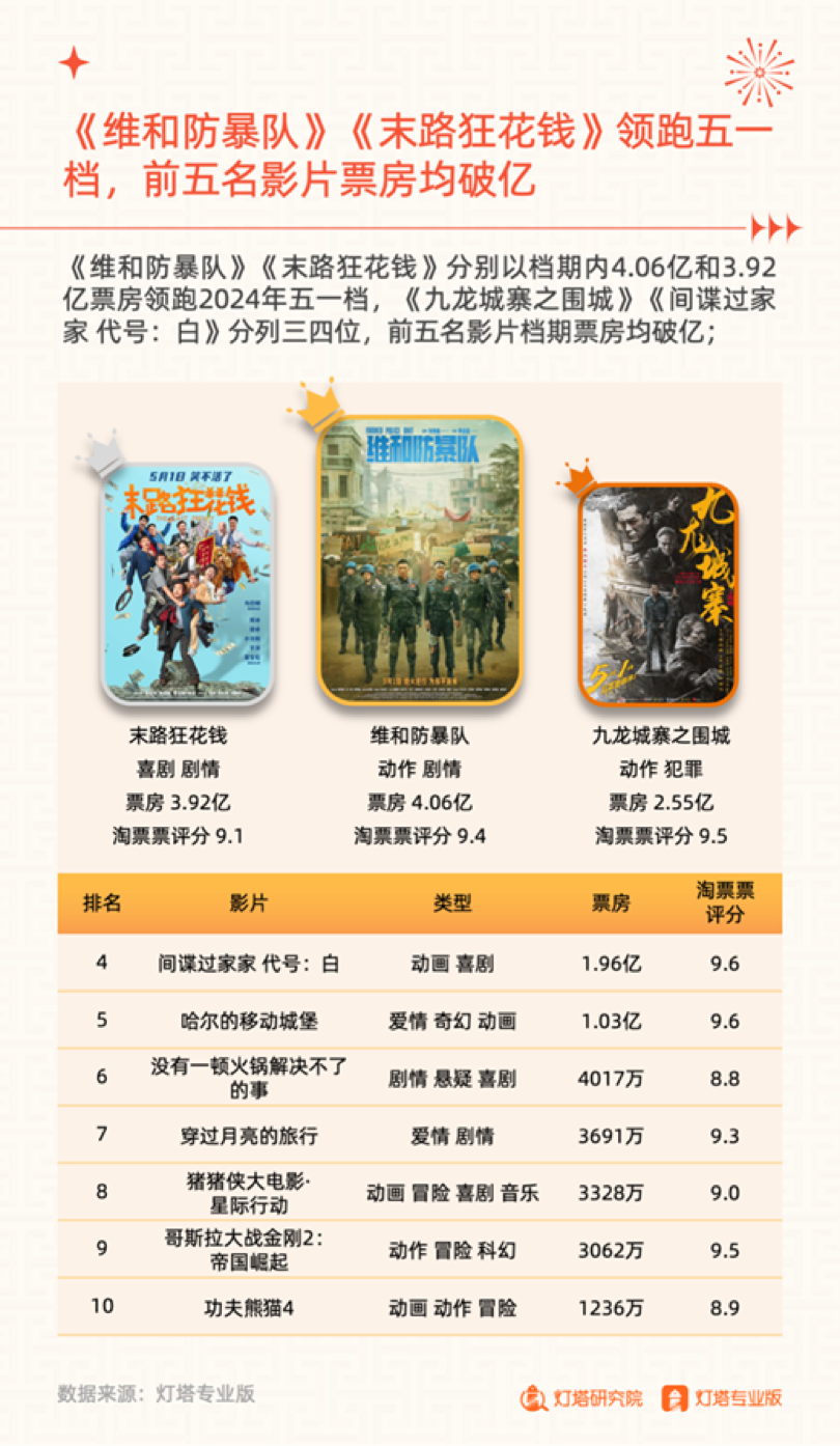 其中,《维和防暴队》以4.06亿元的档期票房领跑五一,《末路狂花钱》3.92亿紧随其后,《九龙城寨之围城》《间谍过家家 代号:白》《哈尔的移动城堡》分列票房榜三至五位。