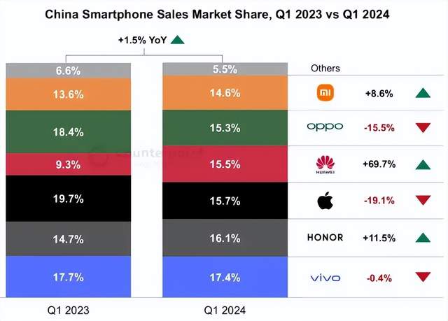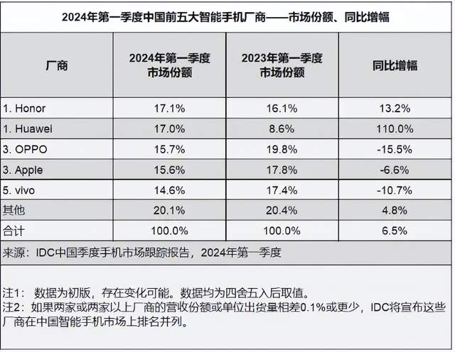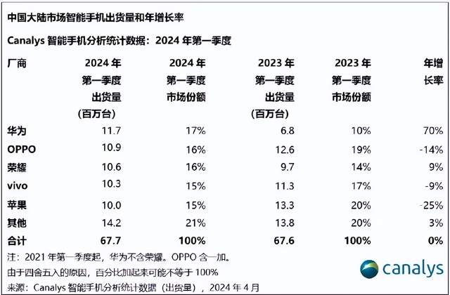 首先看华为,随着其在智能手机市场完成回归,在Mate系列和Nova系列加持下,其在2024年第一季度成为了国内市场最大赢家,但即使如此,其在各家统计机构中的排名却也是不尽相同。