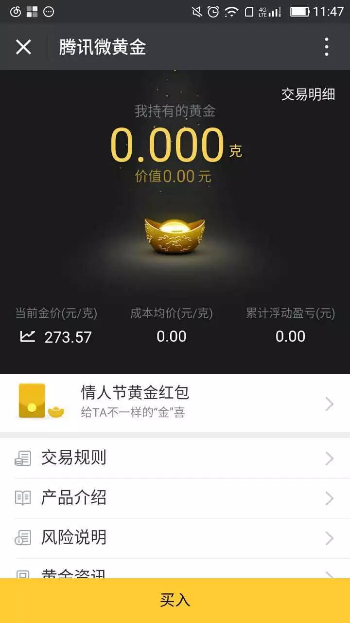 腾讯微黄金分为“微黄金”和“黄金红包”两部分。“微黄金”用于自己购买黄金,点击打开“微黄金”会显示你目前持有的黄金量,点击买入,即可买入。通过微黄金,用户可以直接在网上购买工商银行发售的纸黄金,具有起点低、买卖方便等优势。