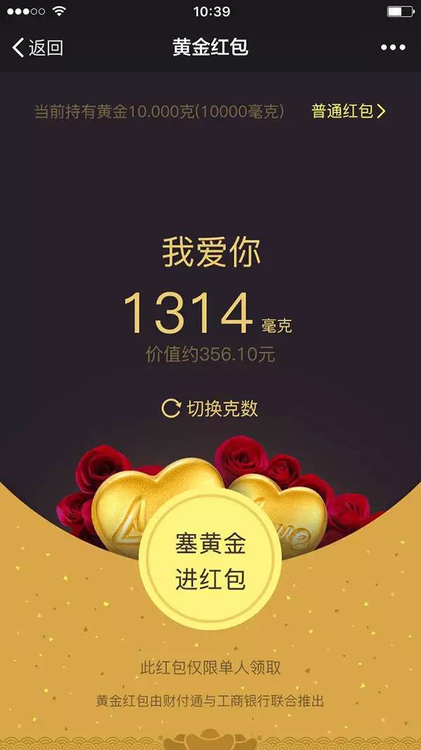 早前有知情人士透露,腾讯在新年期间就已经内测黄金红包,并定于情人节当天向公众开放。在情人节当天,不仅普通数字红包的额度上限被应景的改为520元,黄金红包的额度上限也由原本的1000毫克提高到1314毫克,并且1314毫克的黄金红包每次仅限单人领取。不知道有多少人为了讨好另一半而成为了黄金红包的第一批用户。
