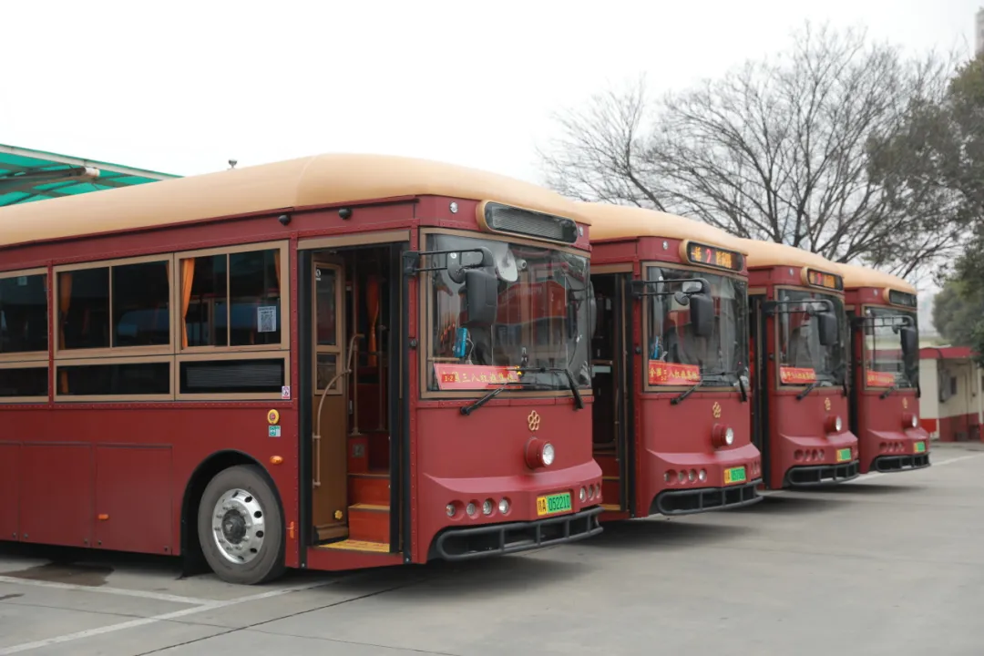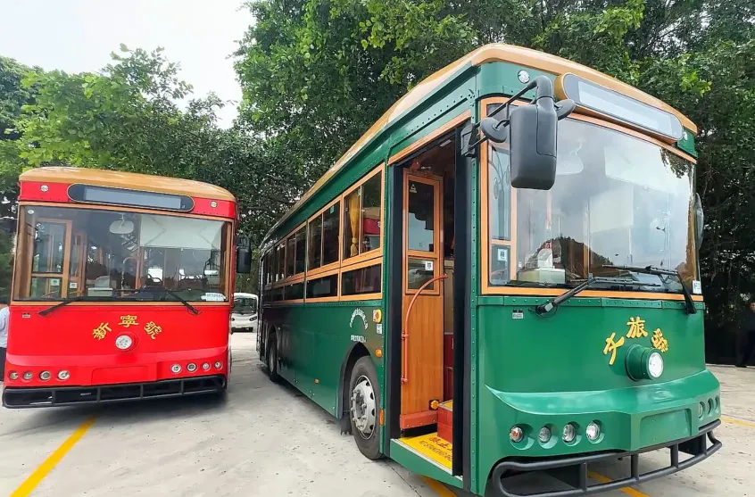 旅游专线上的“老网红”,格力钛新能源仿古铛铛车,酷似民国时期有轨电车,车身喷涂红色高档亚光油漆,车内装有复古吸顶圆灯、仿古黄车顶、棕红色地板,处处充满怀旧感。