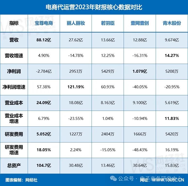 近日,宝尊电商(NASDAQ:BZUN)、丽人丽妆(605136.SH)、若羽臣(003010.SZ)、壹网壹创(300792.SZ)和青木股份(301110.SZ)这五家电商代运营商上市公司相继发布2023年业绩报告。五家公司在营收、净利润、营业成本、研发费用等方面各有千秋,展现出不同的发展态势。对此,网经社电子商务研究中心进行解读。
