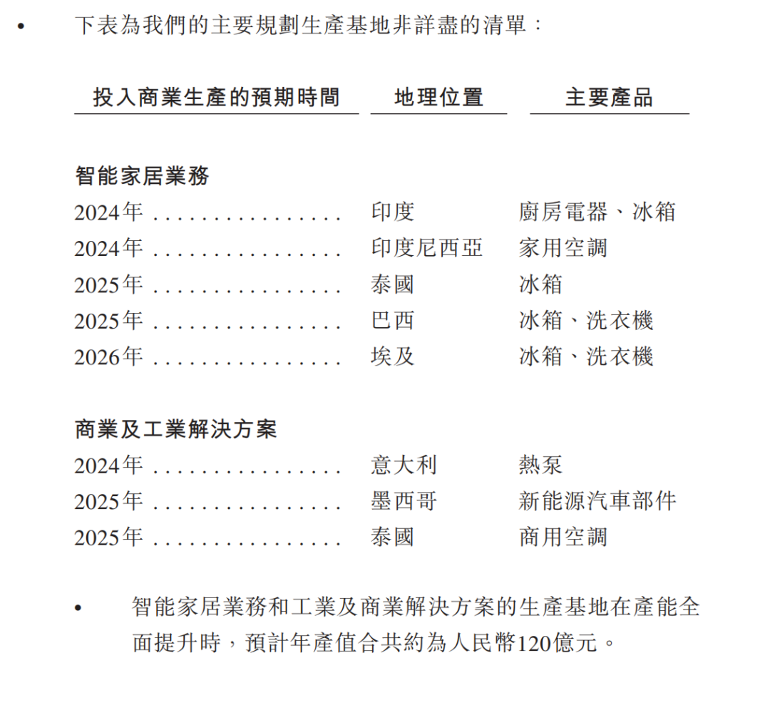 按照美的集团新版招股书所言,募资成功后,2024年将在意大利建设热泵基地、2025年将在墨西哥建设新能源汽车部件工厂……据美的集团预计,其智能家居业务和工业及商业解决方案的生产基地在产能全面提升时,预计年产值合共约为人民币120亿元。