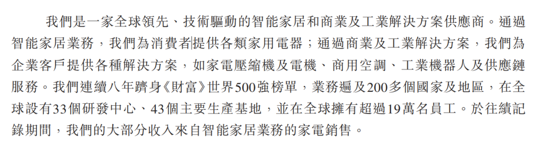 在美的集团递交的新版招股书中,美的集团将自身标称为“我们是一家全球领先、技术驱动的智能家居和商业及工业解决方案供应商。”