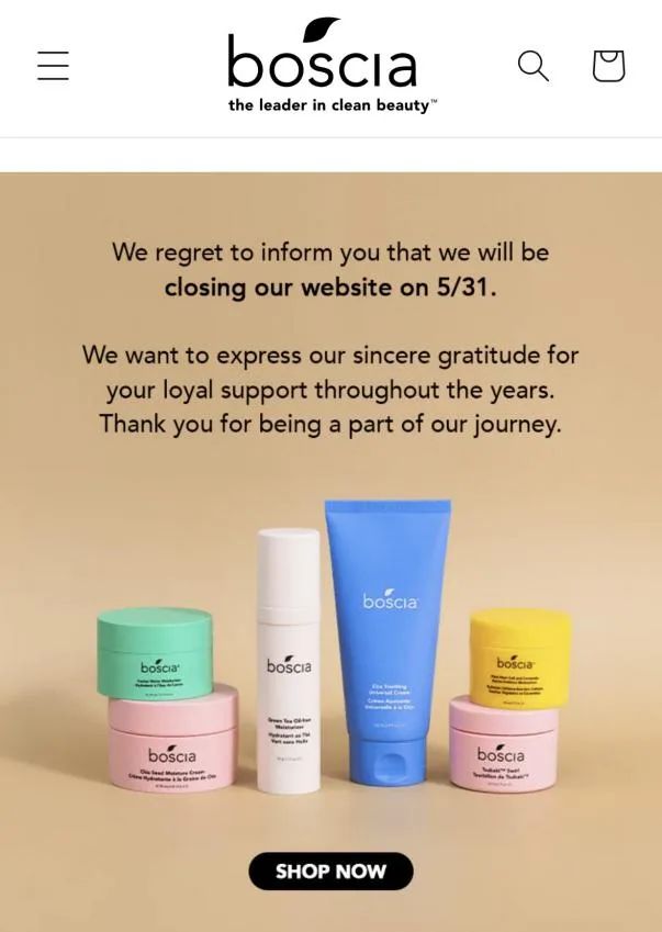 日前,日本Fancl芳珂集团旗下护肤品牌boscia(中文:博倩叶)官网及海外官方账号发布公告称:将于5月31日关闭网站,感谢多年来的忠诚支持,同时boscia开启一整月的闭幕大促——旗下所有产品以45折清仓出售。