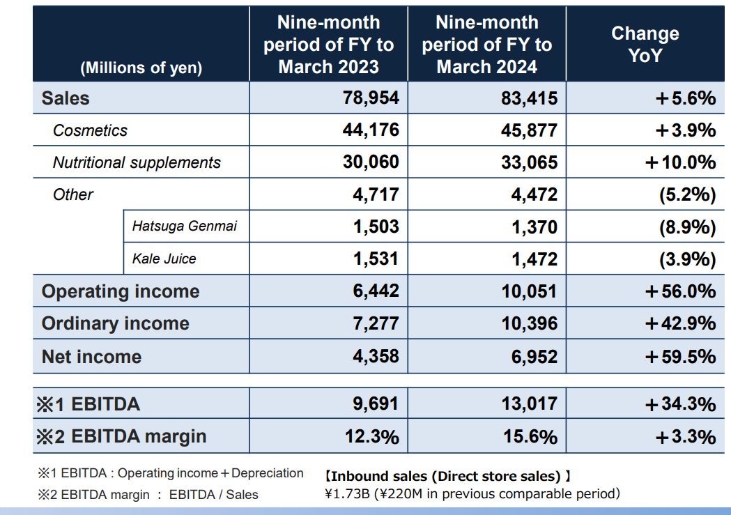 2023年,FANCL集团化妆品业务有所回升。2024财年前三季度(2023年4月-12月),FANCL化妆品业务销售额为458.77亿日元(约合人民币21.51亿元),同比增长3.9%;其中FANCL品牌销售额增长2.6%,达到330.66亿日元(约合人民币15.5亿元);艾天然销售额增长11.9%,达到116.62亿日元(约合人民币5.47亿元)。