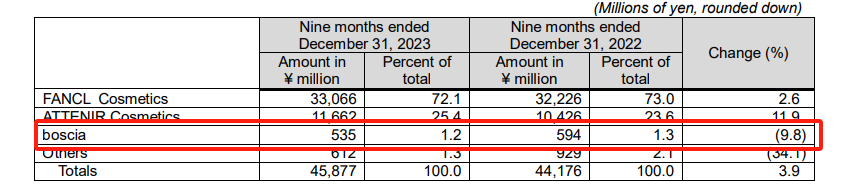 这一论断在FANCL集团财报中得到验证。财报显示,boscia自2019财年(2018年4月-2019年3月)起销售额开始下滑,从巅峰时期的1.6亿人民币,跌至2023财年(2022年4月-2023年3月)的0.37亿人民币。2024财年前三季度(2023年4月-2023年12月),boscia销售额下降9.8%至5.35亿日元(约合人民币0.25亿元)。