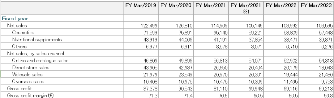 不过,从大盘来看,FANCL集团的化妆品业务近年来发展并不如意。业绩报告显示,集团化妆品业务销售额近些年呈下滑状态,从2020财年(2019年4月-2020年3月)的758.91亿日元(约合人民币35.61亿元)下滑至2023财年(2022年4月-2023年3月)的574.48亿日元(约合人民币26.95亿元)。