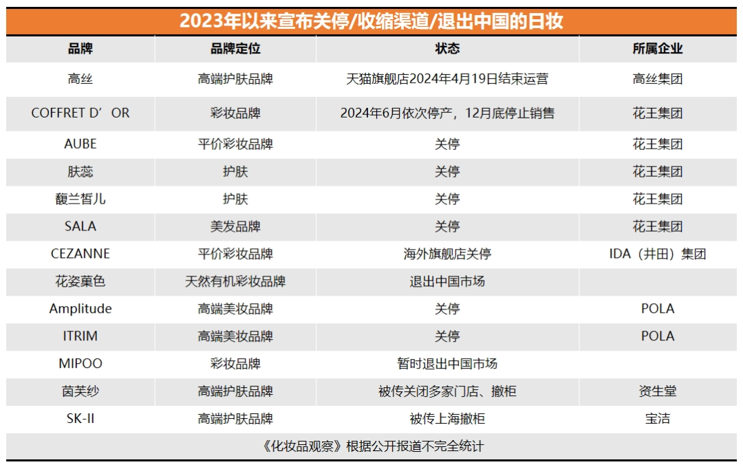 据《化妆品观察》不完全统计,自2023年以来,已有近15个日妆品牌宣布关停或者退出中国市场,仅2024年就有茵芙莎、高丝、SK-II相继传出撤柜、关停品牌旗舰店的消息。