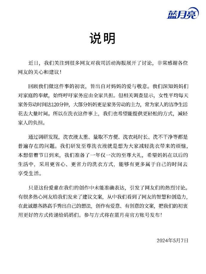 5月7日,针对“妈妈您先用”母亲节广告引发的争议,蓝月亮发文回应称,回顾做这件事的初衷,皆出自对妈妈的爱与敬意。只是这份爱意在创作中未能准确表达。
