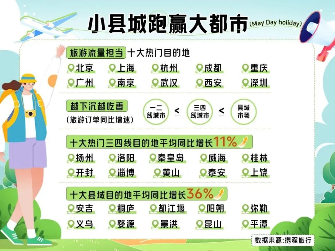 携程数据显示,一二线城市小于三四线城市,三四线城市小于县域市场。安吉、桐庐、都江堰、阳朔、弥勒、义乌、婺源、景洪、昆山、平潭是热门县域旅游目的地,旅游订单平均增长36%。