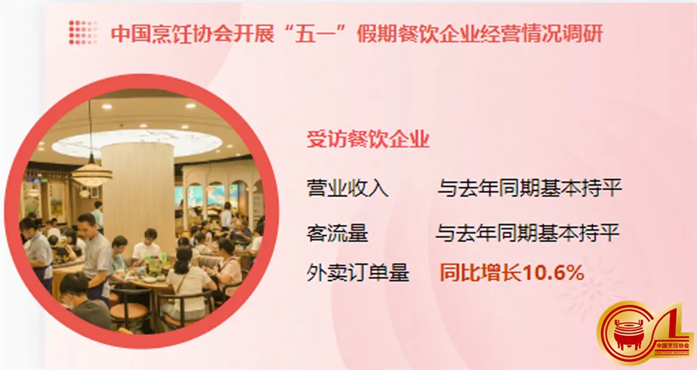 中国烹饪协会对于五一假期餐饮经营情况调研显示,受访餐饮企业营业收入、客流量于去年同期基本持平。