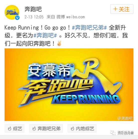 昨天(2月13日)中午12时许,浙江卫视真人秀节目《奔跑吧兄弟》官方微博宣布节目第五季节目将更名为《奔跑吧》,官方微博随后迅速更换名字,并推送了新海报,没有了“兄弟”两个字,只剩下“奔跑吧”,新上线的LOGO维持了先前的字体和黄蓝配色,保留了奔跑状的“R”元素,但“韩标性”的英文名“RUNNING MAN”则改成了“KEEP RUNNING”。@传媒江湖事对媒体表示,《奔跑吧》将不玩撕名牌。